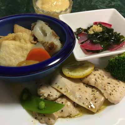 鶏のレモンバターソテーにブロッコリーとエンドウ、おでん、ワカメと紫大根の生姜酢。