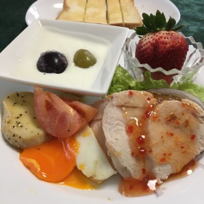 蒸し鶏のスイートチリソースに紫玉葱スライスとレタス、目玉焼きとエリンギ焼にトマト、ヨーグルトに冷凍巨峰とシャインマスカット、いちご。