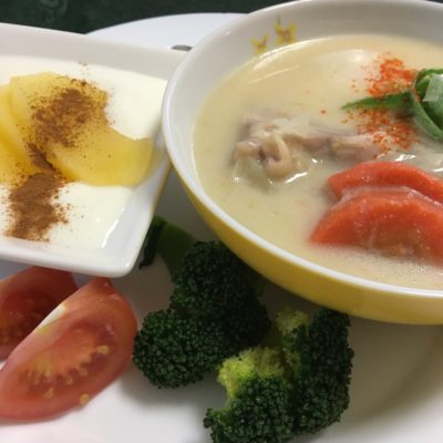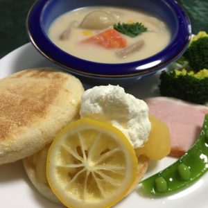 菜花入りアサリのチャウダー、スクランブルエッグにトマトとブロッコリー、りんごとグレープフルーツのフルーツポンチ、ヨーグルトに冷凍シャインマスカット。