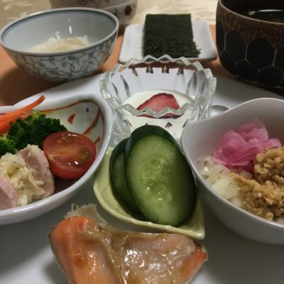 鮭カマの塩焼き、ポテトサラダにブロッコリーとプチトマトにピクルス、自家製胡瓜の浅漬け、玉葱納豆に紫玉葱のピクルス、ヨーグルトと冷凍いちご。