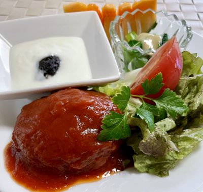 お雑煮、トマトとブロッコリー、ヨーグルトにりんごのコンポート。