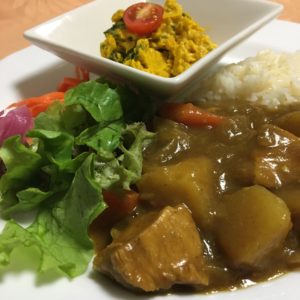チキンカレーライス、レタスとピクルスのサラダ、パンプキンサラダ。