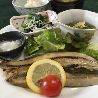 秋刀魚の開きの湯煮に大根おろし、レモンとプチトマトにレタス、小松菜のしらす和え、メカブの生姜酢。