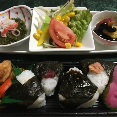 おむすび弁当、メカブとカニカマの甘酢、野菜サラダ、黒豆煮。
