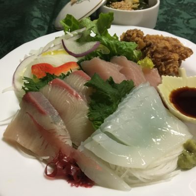 お刺身、サラダ、唐揚げ、ワカメの生姜胡麻酢和え。