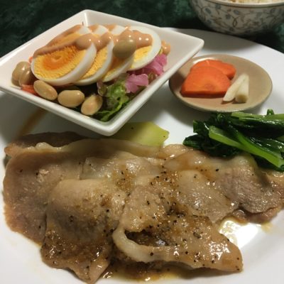 豚の生姜焼きとブロッコリー、小松菜のお浸し、玉子のサラダ、自家製糠漬け。
