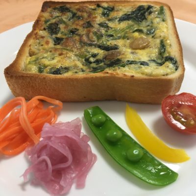パンキッシュ、人参のピクルスと紫玉葱のピクルスにエンドウ、パプリカのピクルスとプチトマト。