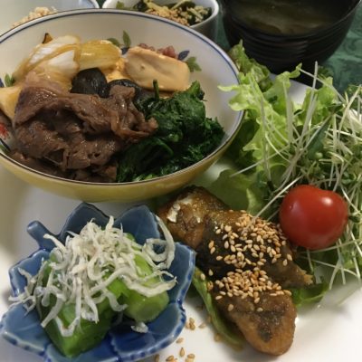 すき焼き、鯵の甘酢サラダ、小松菜のしらす和え、ワカメの生姜酢。