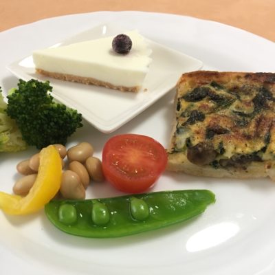 パンキッシュ、蒸し大豆とピクルスにブロッコリー、プチトマトとエンドウ、レアーチーズケーキ。