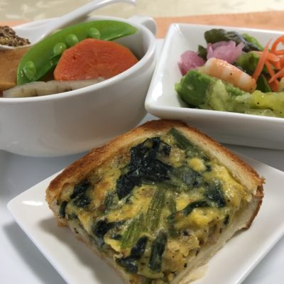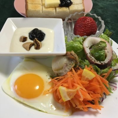 目玉焼き、キャロットラペ、海鮮サラダ、ヨーグルトにプルーンとドライイチジク、いちご。