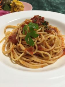 スパゲッティ・ポモドーロ、パンプキンサラダ、レタスとピクルスのサラダ。