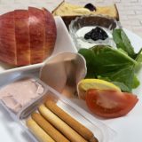 生ハムとリーフサラダ、トマト、ヨーグルトとプルーン、りんご、アンデのデニッシュパン、りんご、キリスティック。