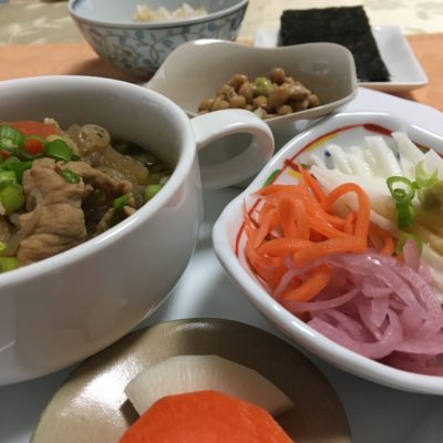 豚汁、千切り長芋とピクルス2種、自家製糠漬け、玉葱納豆。