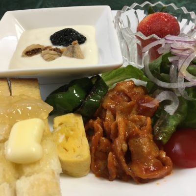 ポークチャップと焼野菜、紫玉葱とレタスのサラダ、玉子焼き、ヨーグルトとプルーンにドライイチジク、いちご。