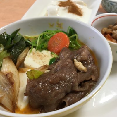 すき焼き、キムチ納豆、バナナヨーグルト。
