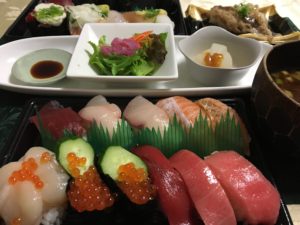握りはカンパチ、本マグロの赤身とトロ、サーモン、帆立、イクラ。