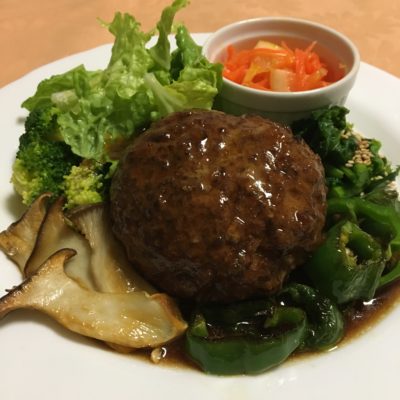 和風おろしハンバーグ、焼野菜とレタス、キャロットラペ。