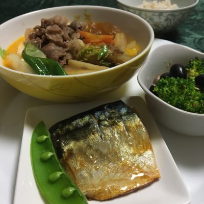 すき焼き、鯖の西京味噌焼とエンドウ、ブロッコリーと黒豆の胡麻和え。