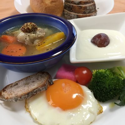 ポトフ、目玉焼き、ブロッコリーとプチトマトに紫大根のピクルス、ヨーグルトと冷凍甲斐路。