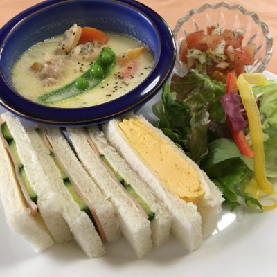 ハムと玉子のサンドウィッチ、サラダ、西京味噌のアサリチャウダー、トマトと玉葱のサラダ。