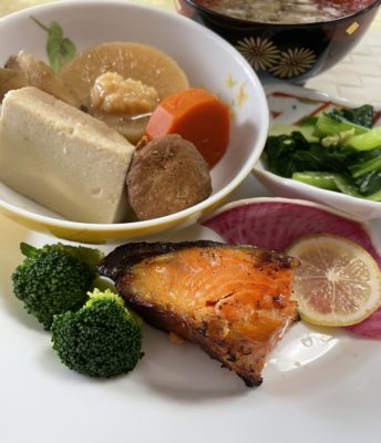 鯖の西京味噌焼に紫大根のピクルスとほうれん草のお浸し、根菜の煮物、金平ごぼう、キムチ納豆。