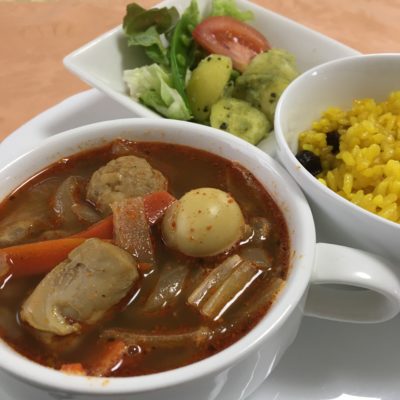 スープカリー、ターメリックライス、野菜サラダとバジル味のポテト。