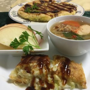 お好み焼き、豚汁、りんご。