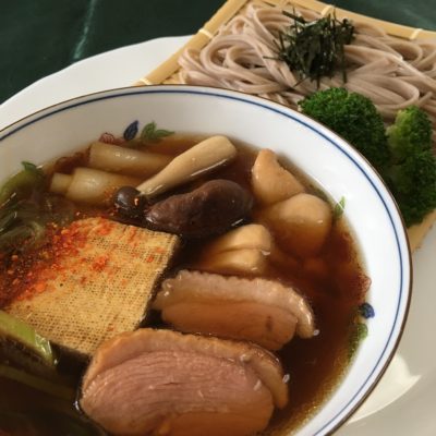 鴨汁、ざる蕎麦とブロッコリー。