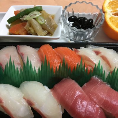握り寿司(桜鯛、トロ、カンパチ他)、肉じゃが、黒豆の甘煮、柑橘。
