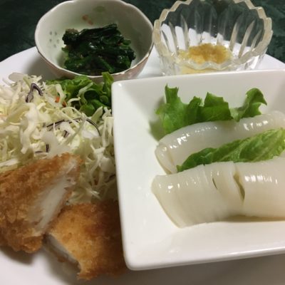 イカの刺身とレタス、イカのフライと千切りキャベツ、ほうれん草の胡麻和え。