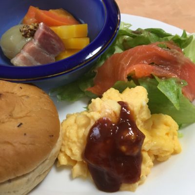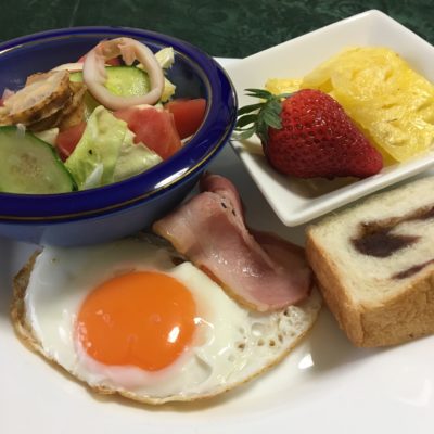 ベーコンエッグ、海鮮サラダ、いちごとパイナップル。