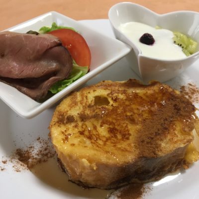 フレンチトースト、ローストビーフサラダ、キウイヨーグルトに冷凍ブラックベリー。