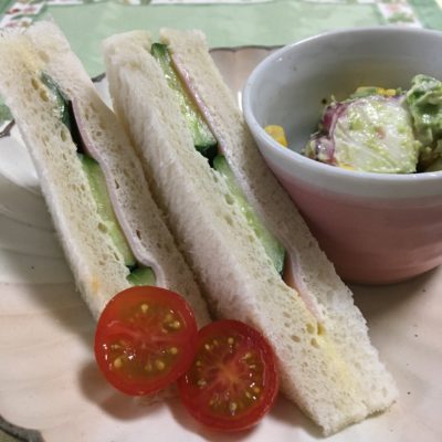 ハムサンドウィッチとプチトマト、タコとアボカドのサラダ。