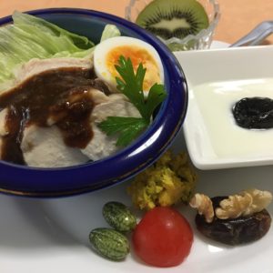 スペアリブの八丁味噌煮込とブロッコリー、金平ごぼう、春雨サラダ、自家製胡瓜の糠漬け。
