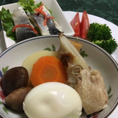 おでん、ニシンの飯寿司とレタス、ブロッコリーとトマト。
