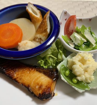 鰤の照り焼きとレタス、おでん、ポテトサラダとエンドウ、小松菜のサラダとトマト。