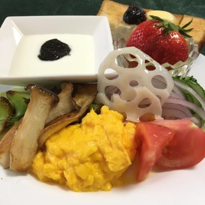 スクランブルエッグ、焼野菜、紫オニオンにレタスと胡瓜のサラダ、蓮根の甘酢とトマト、ヨーグルトとプルーン、いちご。