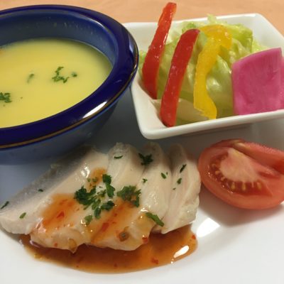 チキンにスイートチリソースとトマト、野菜サラダと紫大根のピクルス、コーンポタージュ。