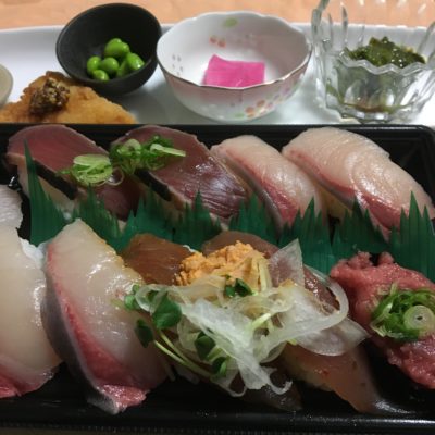 握り寿司(カンパチ、タタキマグロ、かつお他)、メカブの酢の物、紫大根のピクルス、枝豆他。