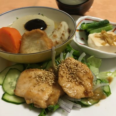 野菜サラダ、鶏の生姜焼き、温奴と小松菜、油麩の煮物とふろふき大根。
