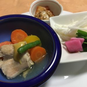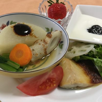 鯖の西京味噌焼とトマト、蓮根の甘酢とレタス、ふろふき大根と根菜の煮物、ヨーグルトとプルーン、いちご。