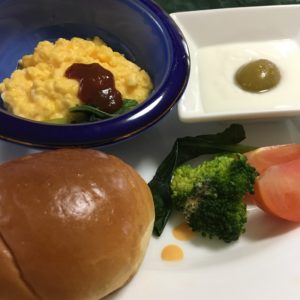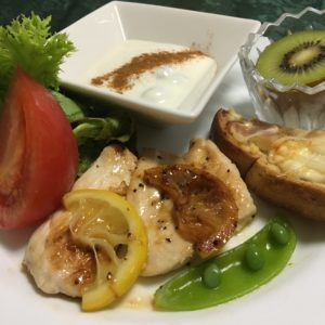 ポークチャップと野菜サラダ、アサリと水菜のコンソメスープ、シリアル。