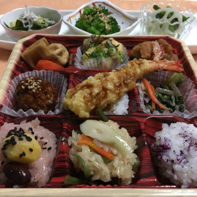 九重弁当、小松菜のしらす生姜和え、ブロッコリーの胡麻和え、蓮根の甘酢。