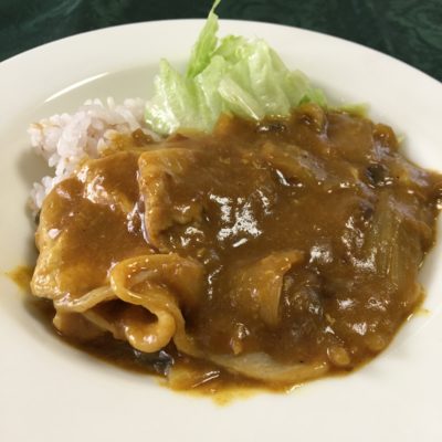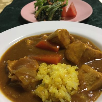 チキンカレーライス、野菜サラダ。