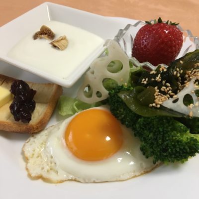 目玉焼き、ブロッコリーと蓮根の甘酢、若布の胡麻酢和え、ヨーグルトとドライイチジク、いちご。