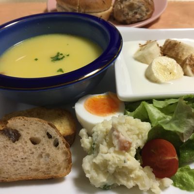 コーンポタージュ、ポテトサラダ、塩玉子、レタスとプチトマト、ヨーグルトとバナナ。