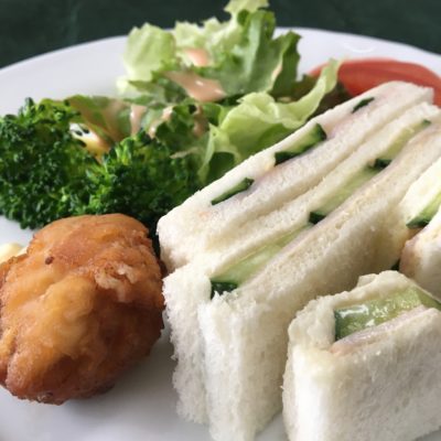 ハムサンドウィッチ、鶏の唐揚げ、ブロッコリーとレタスにトマト。