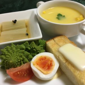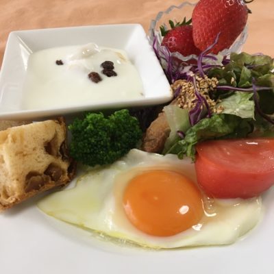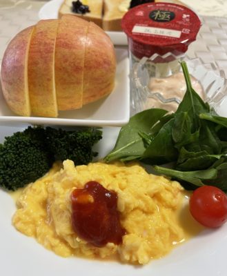りんご食パン、目玉焼き、鯖味噌とレタスのサラダ、ブロッコリーとトマト、ヨーグルトにバナナとレーズン、いちご。