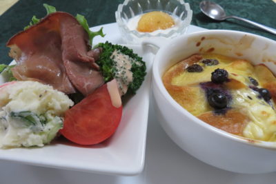 パンプディング、ローストビーフサラダ、ポテトサラダ、ヨーグルトと冷凍柿。