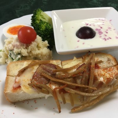 金平ごぼうチーズトースト、ポテトサラダとプチトマト、塩玉子とブロッコリー、ヨーグルトと冷凍巨峰。